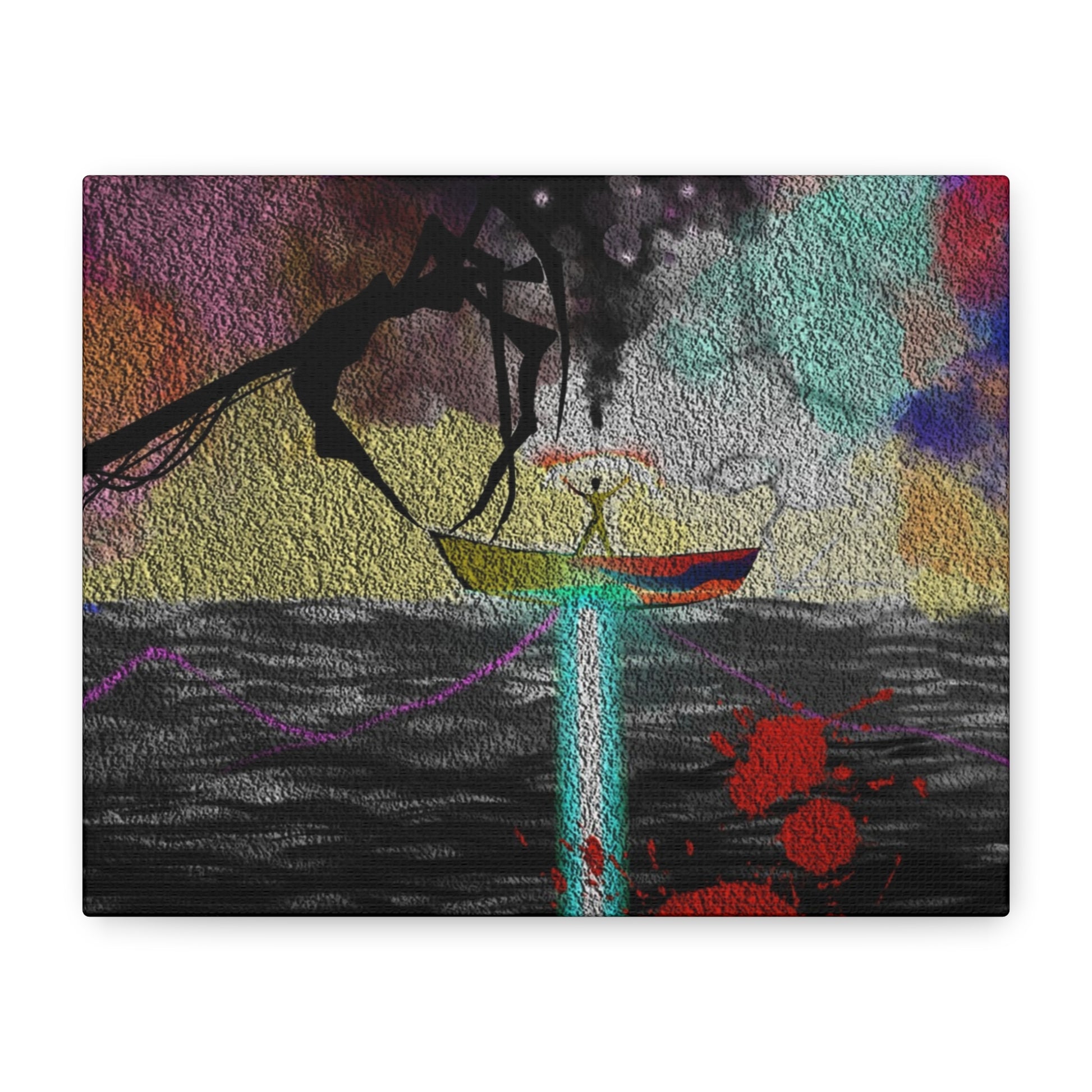 Elevate Your Space with Surreal Mystery Dive into a world where reality meets the subconscious. This captivating piece, titled "Ararat," features a striking contrast between dark, looming shadows and a vibrant, cosmic sky. The central figure in the boat, set against a backdrop of textured colors and a mysterious crimson splash, creates a powerful focal point that invites deep reflection and conversation.